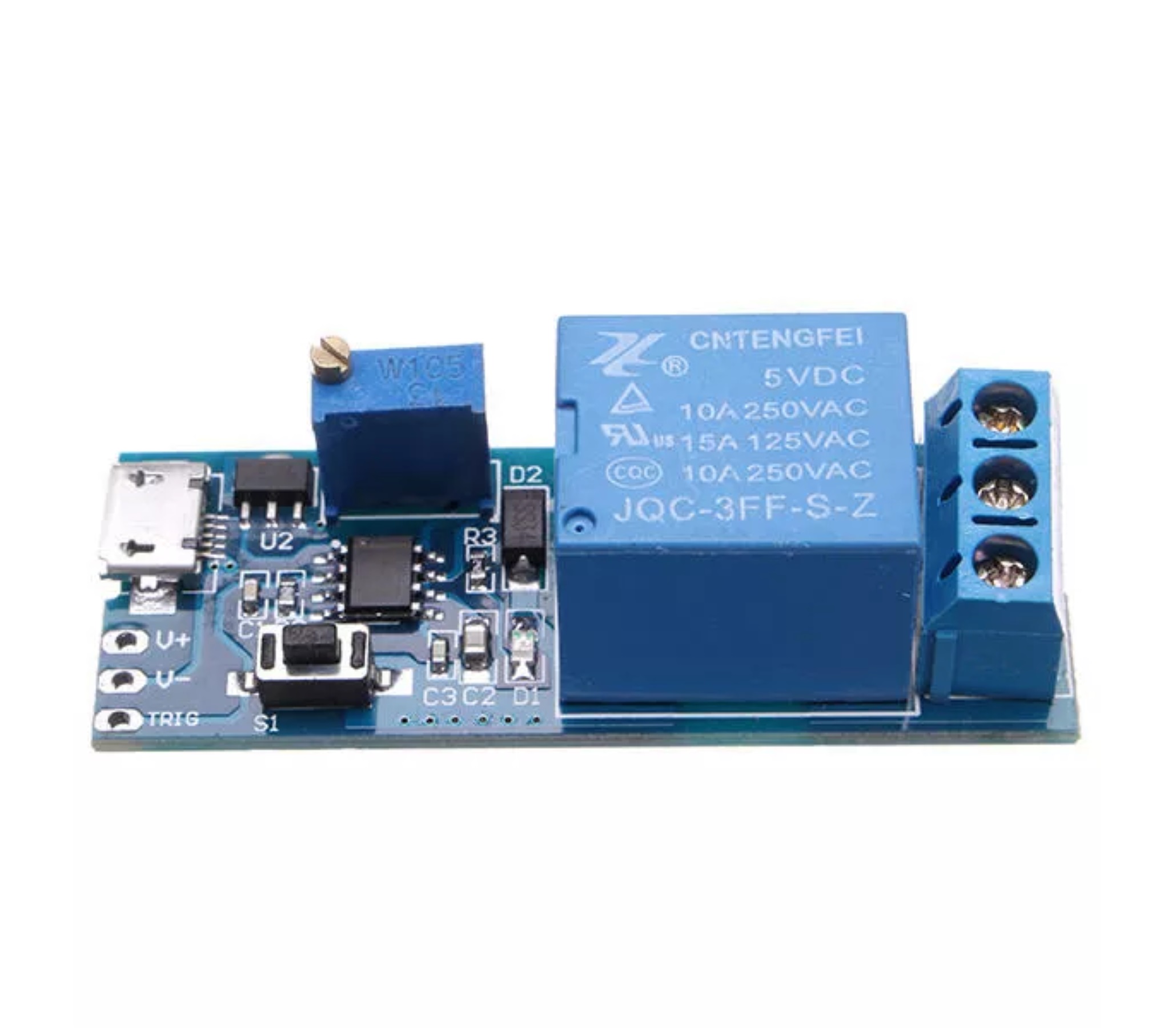 قرار گرفتن ورودی USB منبع تغذیه و ترمینال بر روی ماژول رله با ولتاژ قابل تنظیم 5 ولت تا 30 ولت باعث شده که بتوان به سادگی و آسانی با این ماژول ارتباط برقرار کرد. با پتانسیومتر قرار گرفته بر روی این ماژول میتوان زمان تاخیر را بین صفر تا 24 ثانیه تنظیم کرد و از طریق فرمول T = 1.1RC زمان تاخیر محاسبه میشود که در این فرمول R مقدار مقاومت بر حسب اهم و C ظرفیت خازن بر حسب فاراد و یا پتانسیومتر است، به عنوان مثال با یک خازن 22uf و یک مقاومت 1M مقدار زمان تاخیر به صورت زیر محاسبه میشود: